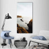 Ocean cliffs and rocky shorelines appear in warm golden-hour light, with sunlight catching the water and cliff faces to create a calm, photorealistic coastal scene. The composition emphasizes depth and the rule of thirds to draw the eye across the view. Works well in coastal or modern nature-inspired rooms as a peaceful focal piece.