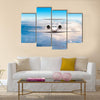 A twin-engine private jet flies above soft clouds in a modern, realistic canvas print. The blue, white and gray palette creates a calm, aspirational atmosphere that suits contemporary homes and modern rooms.