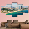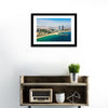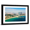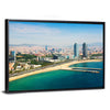 Aerial View of Barcelona shows the city skyline meeting a curving beach and calm blue water from a high aerial perspective. The modern, travel-focused print uses blue, teal, yellow and white to create a vibrant, sunny, energetic atmosphere that works well in contemporary or coastal-inspired rooms.
