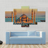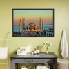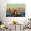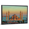 This canvas features the iconic Blue Mosque of Istanbul at sunset, showcasing its multiple minarets and stunning dome against a serene waterfront. The peaceful color palette of blue, orange, and gold creates a calming atmosphere, perfect for any space.