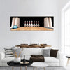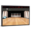 This panoramic canvas shows bowling pins in a standard formation with a textured blue ball rolling down a wooden lane. The clean, athletic graphic look fits modern and sports-focused rooms, bringing a focused, energetic mood to game areas or casual living spaces.