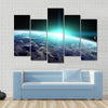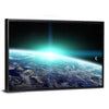 This modern landscape artwork depicts planet Earth at sunrise, showcasing its glowing atmosphere and visible city lights. The crescent moon adds a touch of wonder, creating an awe-inspiring scene that enhances any room's decor.
