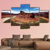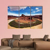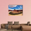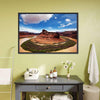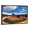 Canyonlands National Park canvas shows horseshoe bend, a sediment-rich river, layered canyon rock formations and clouds in a wide-angle landscape. The orange, brown, green, blue and white palette gives a grand, natural, awe-inspiring mood. It fits modern homes and room decor that favor landscape wall art.