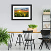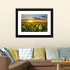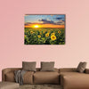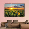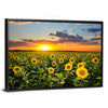 Blooming Sunflowers Canvas Wall Art captures a sunflower field at sunset, conveying a serene, vibrant evening mood. The wide-angle, realistic composition with dramatic clouds and depth uses yellow, green, blue, and orange tones that suit modern homes and living rooms.