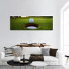This photorealistic panoramic canvas captures a golf ball teetering on the edge of the hole in an extreme close-up, rendered in greens, whites, browns, and blues. The focused, precise, and calm image fits modern game rooms, offices, or sports-themed spaces.