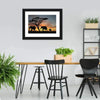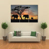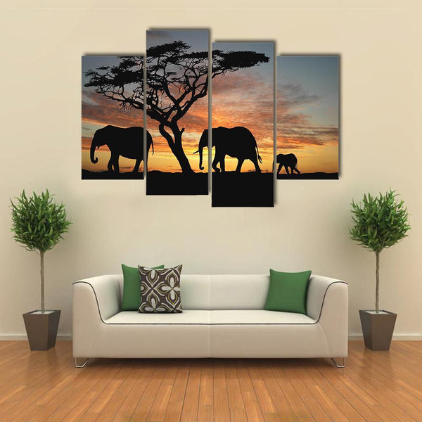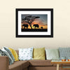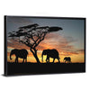 This stunning canvas art captures a serene scene of three elephants silhouetted against a dramatic sunset. The combination of warm oranges and deep blues evokes a peaceful atmosphere, perfect for celebrating wildlife and nature.