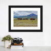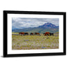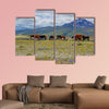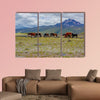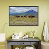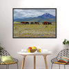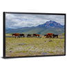 Herd Of Wild Horses Canvas Wall Art depicts a herd of horses grazing on a mountain field beneath a cloudy sky, using a calm palette of green, brown, blue, and gray. The composition emphasizes depth and the rule of thirds for a serene, natural feel that suits rustic or modern home decor.