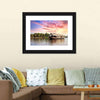 Houseboat in Kerala is captured at sunset in a photorealistic landscape, showing tropical trees, sky and calm water. Soft pink, blue, green and brown tones with cloud formations and water reflections create a serene mood that suits modern living rooms and bedrooms.