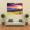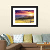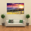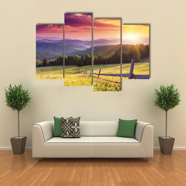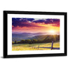 This landscape artwork captures a serene sunset over rolling hills and a meadow, framed by lush forests and a charming fence. The vibrant colors of purple, orange, green, yellow, and blue blend beautifully, creating a peaceful atmosphere for any space.