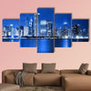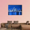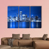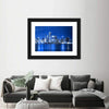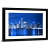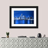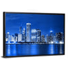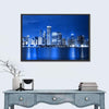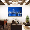 A canvas print of the Chicago skyline at night, with illuminated skyscrapers and shimmering water reflections along the waterfront. Its cool blue, white, and black palette creates an urban, serene, electric mood that fits modern living rooms, offices, or hallways.