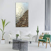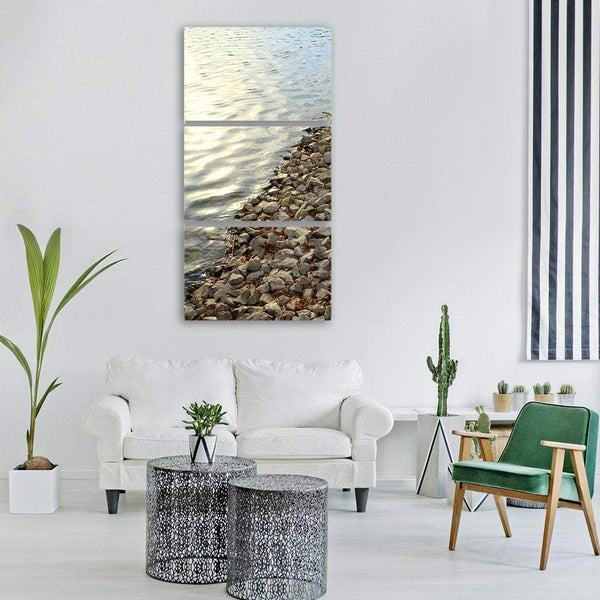 Rocky Beach With Lake Canvas Wall Art depicts a rocky shore with rippling water and fallen leaves, rendered in blue, gray, brown, and white. The diagonal composition and shallow depth of field create a calm, serene, natural mood that works well in modern or minimalist rooms and nature-themed spaces.