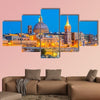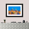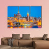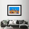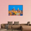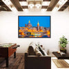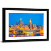 This canvas captures the nighttime skyline of Valleta, Malta, showing domes, spires and a glowing waterfront. The illuminated, vibrant yet serene palette of blues, golds and warm browns creates a calm focal point for modern wall decor.