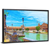 Spain Square in Seville shows an eye-level, realistic view of an ornate bridge, waterway and arched building facade. Its bright, sunny palette of blue, green, brown and white creates a vibrant, peaceful atmosphere that suits modern homes and room decor.