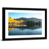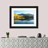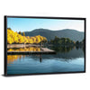 Sunrise at Wapato Resort on Lake Chelan shows a quiet lakeside morning with a dock, trees, and distant mountains. Rendered in a realistic style with blue, yellow, green, and brown tones, it feels serene and autumnal, with fall foliage and reflections on the water. This calm nature scene suits home rooms looking for a peaceful, natural focal point.