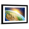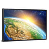 Sunrise Over the Earth Canvas Art shows Earth from space as the sun bursts over the horizon and North America comes into view against a field of stars. The photorealistic image uses blue, green, brown and warm yellow to evoke a serene, awe-inspiring sense of scale. It suits modern interiors and room decor that favor nature- or space-inspired artwork.