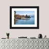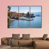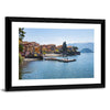 Photorealistic view of the town of Varenna on Lake Como, Milan, Italy, showing colorful buildings along the shore, boats docked, and a clear summer sky. The scene feels peaceful, serene, and bright — a scenic choice for modern or Mediterranean-style rooms seeking a calm focal point.