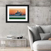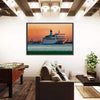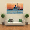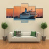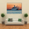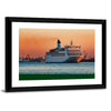 White Passenger Ship Canvas Wall Art depicts a white passenger cruise ship at a port, with water and sky rendered in blue, orange, white, and grey tones. The realistic image uses a rule-of-thirds composition and captures a calm, serene sunset scene with smoke rising from the ship's chimney. It suits modern home decor and room settings.