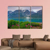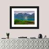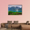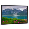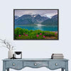 Wild Flowers in Glacier Bay National Park, Alaska presents a photorealistic landscape of pink wildflowers and lush green bushes before a blue lake and snow-capped mountains. The scene reads serene, majestic and vibrant with a cool palette of blues, greens, grays and whites. It works well in modern home interiors or nature-inspired rooms.