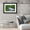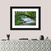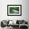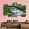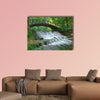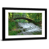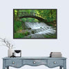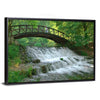 A peaceful landscape showing a curved wooden bridge over a small waterfall set amid lush forest. The medium, eye-level composition and a green, brown, white and gray palette creates a calm, natural mood. Suits nature-inspired or rustic home decor and pairs with modern canvas art collections.
