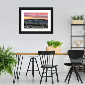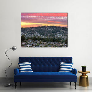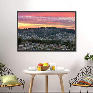 Valley in Oregon shows an aerial view of a suburban neighborhood and surrounding forest at sunset, named for the Oregon valley it depicts. Soft pinks and oranges mix with green and gray across rows of houses, dense trees, and streaky clouds to create a serene, colorful mood. Suited to modern rooms and nature-themed spaces.