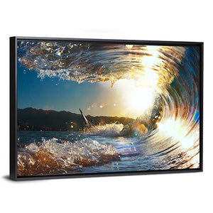 Curly Breaking Wave Canvas Wall Art shows a photorealistic ocean scene with a curling, foam-topped wave, sunlight refracting through the water, a bright sun, and a distant sailboat. The energetic, dynamic, bright composition and blue-gold palette suit modern or seaside room decor.