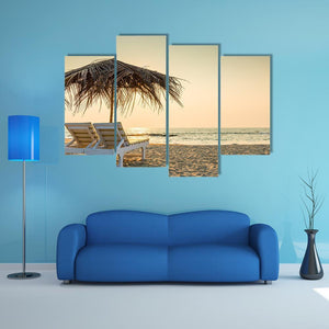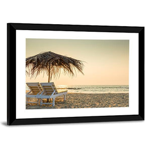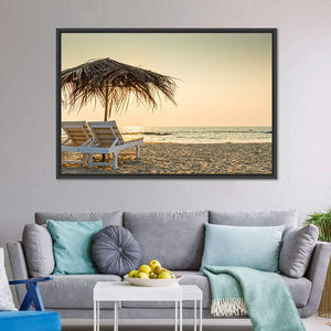 This photorealistic canvas art features a serene beach scene with two lounge chairs and a tropical umbrella, evoking a peaceful atmosphere. Perfect for adding a touch of relaxation to any room.