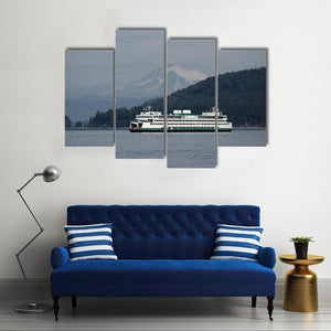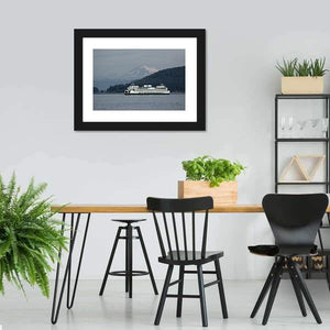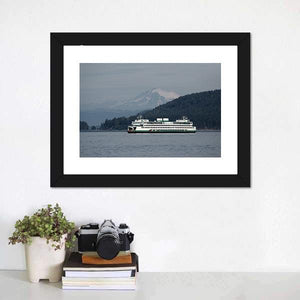 This serene canvas art features a large ferry sailing on calm waters, framed by a majestic snow-capped mountain and lush forested hillsides. The tranquil composition combines soothing blue and green hues, making it a perfect addition to any nature-inspired decor.