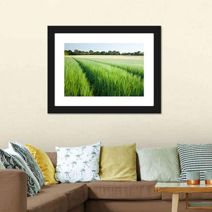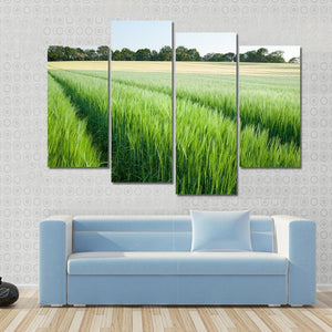 This canvas captures a peaceful landscape of a green wheat field, framed by a line of trees and a clear blue sky. The vibrant colors and serene composition create a natural atmosphere, perfect for enhancing your home decor.
