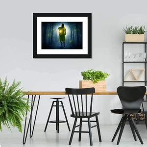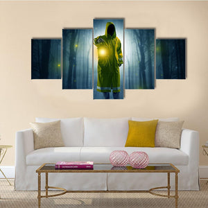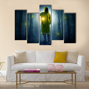 This canvas shows a hooded figure holding a lantern in a shadowed forest, with glowing particles drifting through the trees. The dark blue, green, yellow and grey palette gives the scene a mysterious, eerie, surreal atmosphere that fits modern or moody interiors.