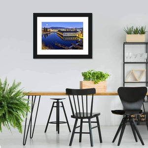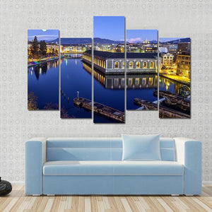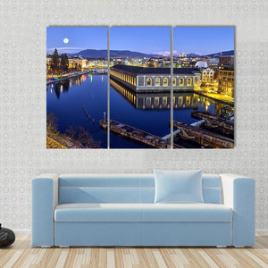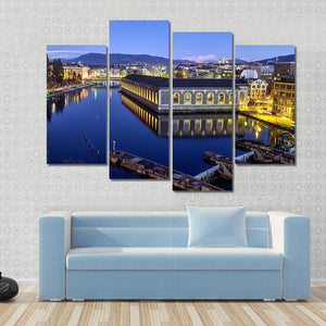 This canvas art captures a serene twilight scene featuring a waterfront cathedral tower and the gentle reflection of the Rhone River. The calming palette of blues and whites creates a peaceful atmosphere, perfect for enhancing your room decor.