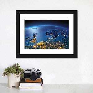 This landscape art captures Europe at night from an aerial perspective, showcasing the intricate patterns of city lights and coastlines. The illuminated blue and golden palette evokes a sense of vastness and connection.