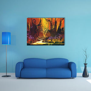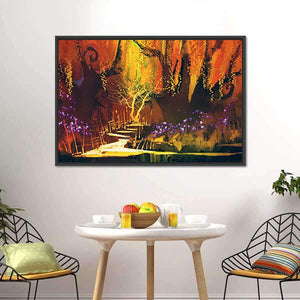 A winding forest path threads between bare-branched trees and scattered flowers in an abstract, painterly scene that feels magical and mysterious. Warm oranges, purples and greens play with dappled light and strong leading lines, making this piece a calm focal choice for modern living rooms or bedrooms.