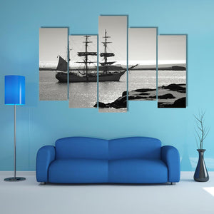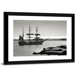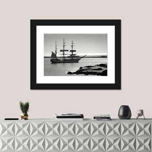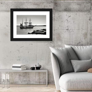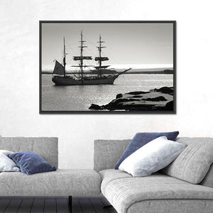 Sailing Ship At Dawn shows a tall ship with full sails near rocky shore, rendered in a monochromatic gray palette that reads both dramatic and serene. The rule-of-thirds composition and vintage, cinematic tone make it a quiet focal point for modern home decor or muted nautical interiors.