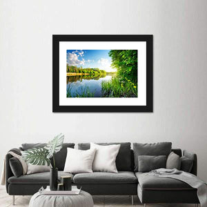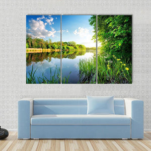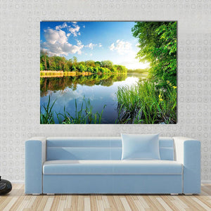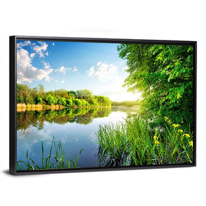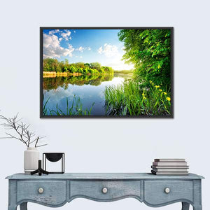 This serene canvas wall art captures the tranquil beauty of trees reflecting in a calm river. The bright blue and green palette, featuring sunlight filtering through the leaves, brings a refreshing atmosphere to your space.