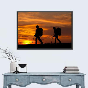 Two silhouetted hikers cross a warm sunset sky, blending orange, yellow and red into a calm, adventurous scene. The minimalist, modern composition follows the rule of thirds and fits well in modern home decor and room accents.