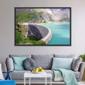 Kaprun Dam Canvas Wall Art captures a wide-angle landscape of a curved concrete dam, turquoise water, and surrounding mountains and green hills. The realistic scene feels majestic and serene and suits modern or nature-inspired rooms such as living rooms, offices, or entryways.