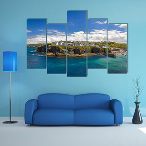 This canvas art beautifully depicts a serene coastal village set against a backdrop of cliffs, a vibrant ocean, and a bright blue sky. Its realistic style captures the idyllic charm of Port Isaac, making it a delightful addition to your wall decor.
