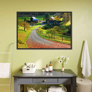 Country Charm shows a farmhouse beside a winding country road carpeted with fallen autumn leaves, capturing a peaceful, nostalgic scene. Warm greens, browns, oranges and soft blues give the print a rustic, vintage feel that suits country or farmhouse-style room decor.