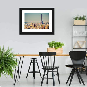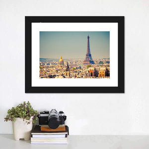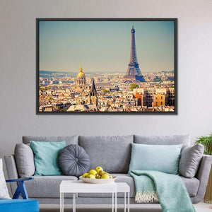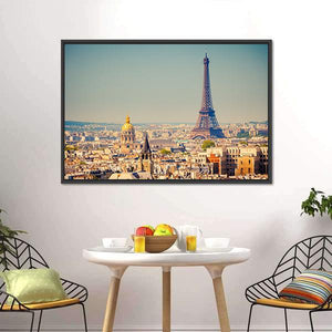 This canvas art features an iconic view of the Eiffel Tower against a sunny Paris skyline. The vibrant palette of blues, golds, and tans creates an urban vibe, making it a striking addition to any wall.