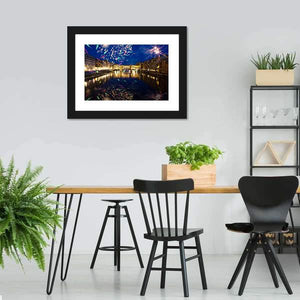 This artwork captures fireworks bursting over a river and bridge at night, with illuminated buildings and shimmering water reflections. Rich blues, purples, greens and bright yellow-white bursts create a vibrant, magical mood that fits modern living rooms or entryways.