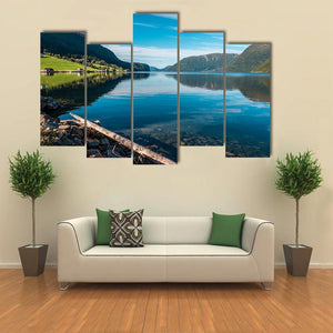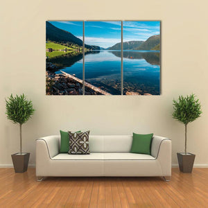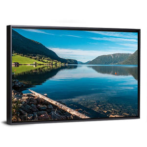 Fjord With Mountains shows a calm Norwegian fjord with mountains, shoreline and a log in the foreground beside a glassy lake that reflects nearby rocks. The realistic landscape uses blues, greens, browns and grays to create a serene, peaceful mood with strong depth. Suited to modern or nature-inspired rooms as wall decor.