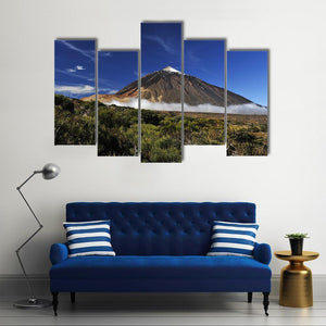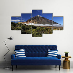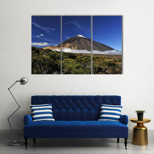 This captivating canvas art features the majestic snow-covered peak of Teide, surrounded by low-lying clouds and lush vegetation. Its serene blue and green palette evokes a sense of awe that complements any nature-inspired décor.
