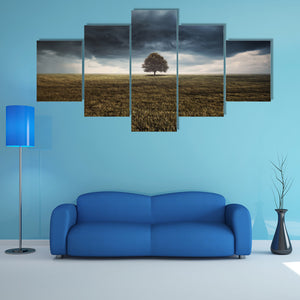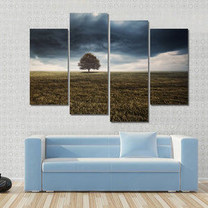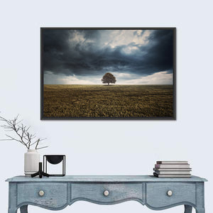 Tree In Field Under Storm Clouds Canvas Wall Art