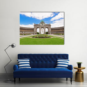 This canvas wall art features the grand Triumphal Arch in Brussels, set against a serene sky. The realistic portrayal includes a chariot sculpture atop the arch and a vibrant flower bed, bringing a touch of Belgium's beauty to your space.