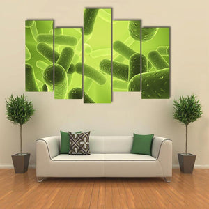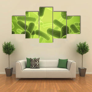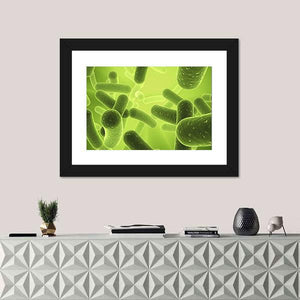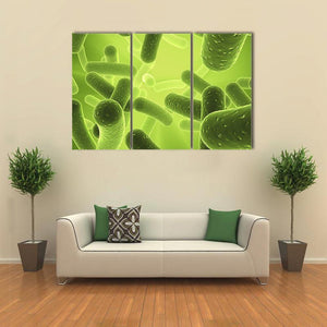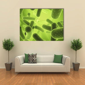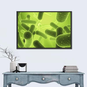 This canvas depicts rod-shaped bacillus bacteria and other microscopic organisms in an overlapping, depth-driven composition. A lime, green, and yellow palette with a glowing background creates a scientific, organic, illuminated mood. It suits modern homes or science-themed rooms as artful wall decor.