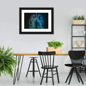 This canvas shows a centered, wireframe representation of human lungs rendered in blue, green and purple tones with glowing lines. The abstract digital treatment reads as scientific and futuristic with a modern technological edge. It suits modern homes and science-themed rooms as thoughtful wall decor.