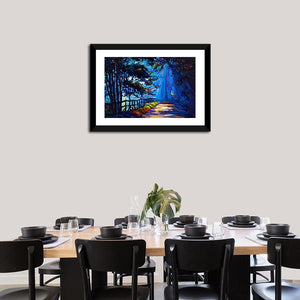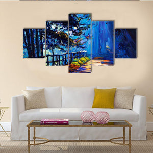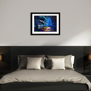 Autumn Park At Night shows a forest path framed by trees and a weathered fence, set against cool night tones with patches of dappled sunlight. Rendered in impressionistic, impasto brushstrokes and a blue, green, yellow, purple and orange palette, the scene feels mysterious, tranquil and ethereal—suitable for modern living rooms or bedrooms.
