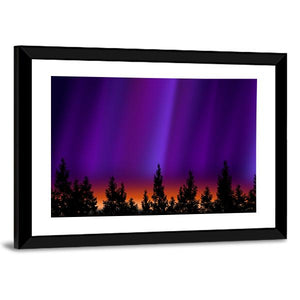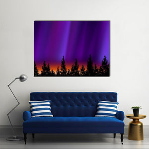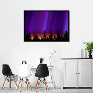 This captivating canvas features the enchanting aurora borealis, framed by silhouetted pine trees against a vibrant sky. The mystical palette of purple and orange evokes a serene atmosphere, making it a striking addition to any nature-inspired décor.