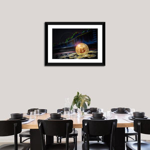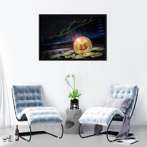 This canvas art prominently features bitcoin coins and a financial graph, creating a modern and abstract atmosphere. The rich palette of gold, silver, and deep blues adds depth, making it an intriguing statement piece for technology enthusiasts.