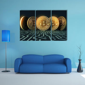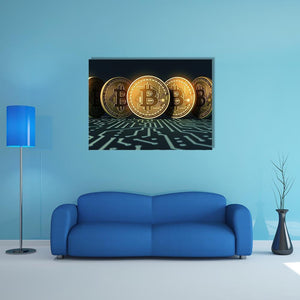 This canvas art showcases three bitcoin coins against an intricate circuit board backdrop, featuring a striking palette of gold, black, and green. Its futuristic vibe makes it a captivating addition to modern technology-themed décor.